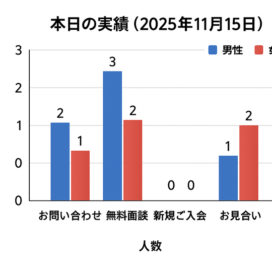 - 本日はお問い合わせと無料面談が堅調で、出会いの母数を着実に育てられた一日でした。新規ご入会はゼロでしたが、無料面談の質と次回アクションの明確化により、来週以降のご入会・お見合いへ自然に繋げられる状態です。