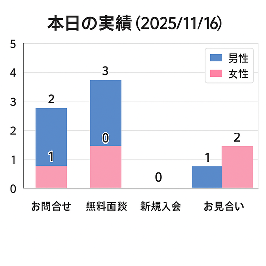 - 本日はお問い合わせ・面談ともにバランスよく動きがあり、入会検討前の情報収集段階の方が多い一日でした。お見合いは土日の稼働に合わせて適正に進行しており、交際中の方にはお相手理解を深める具体的なデート設計(予算・所要時間・話題の準備)を引き続きご提案いたします。