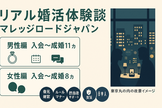 マレッジロードジャパン仲人のQでございます。本日は、実際に当会でご活動いただいた会員様のリアルな体験談を、オープニングとしてご紹介いたします。ご入会の経緯から活動中のエピソード、そしてご成婚に至るまでの道のりを、できるだけ具体的にまとめました。結婚相談所が気になっていらっしゃる方の背中をそっと押せる内容を心がけております。どうぞご参考になさってください。